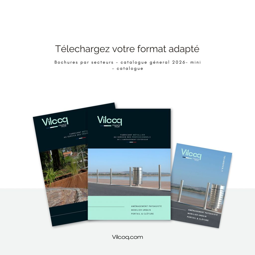 Découvrez le nouveau mini catalogue Vilcoq : un format de poche pratique offrant une vision globale de nos produits, facile à distribuer et à consulter pour tous vos projets d’aménagement extérieur.